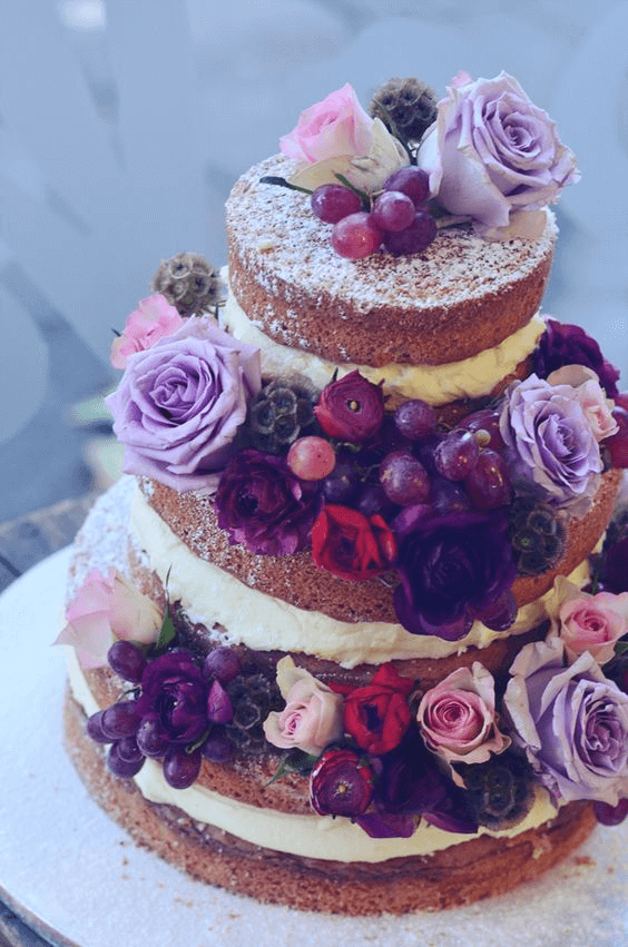 Or opt for a naked wedding cake and use purple fruits and flowers to decorate. Simple yet effective…