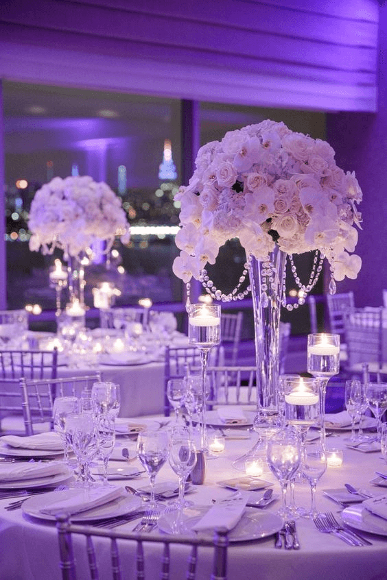 Or be very clever and show couples how effective purple lighting can look alongside sophisticated whites and crystal table decorations…