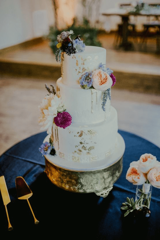 This beautiful wedding cake uses just a touch of purple with the subtle focus being the gold leaf detail and drops of liquid gold…