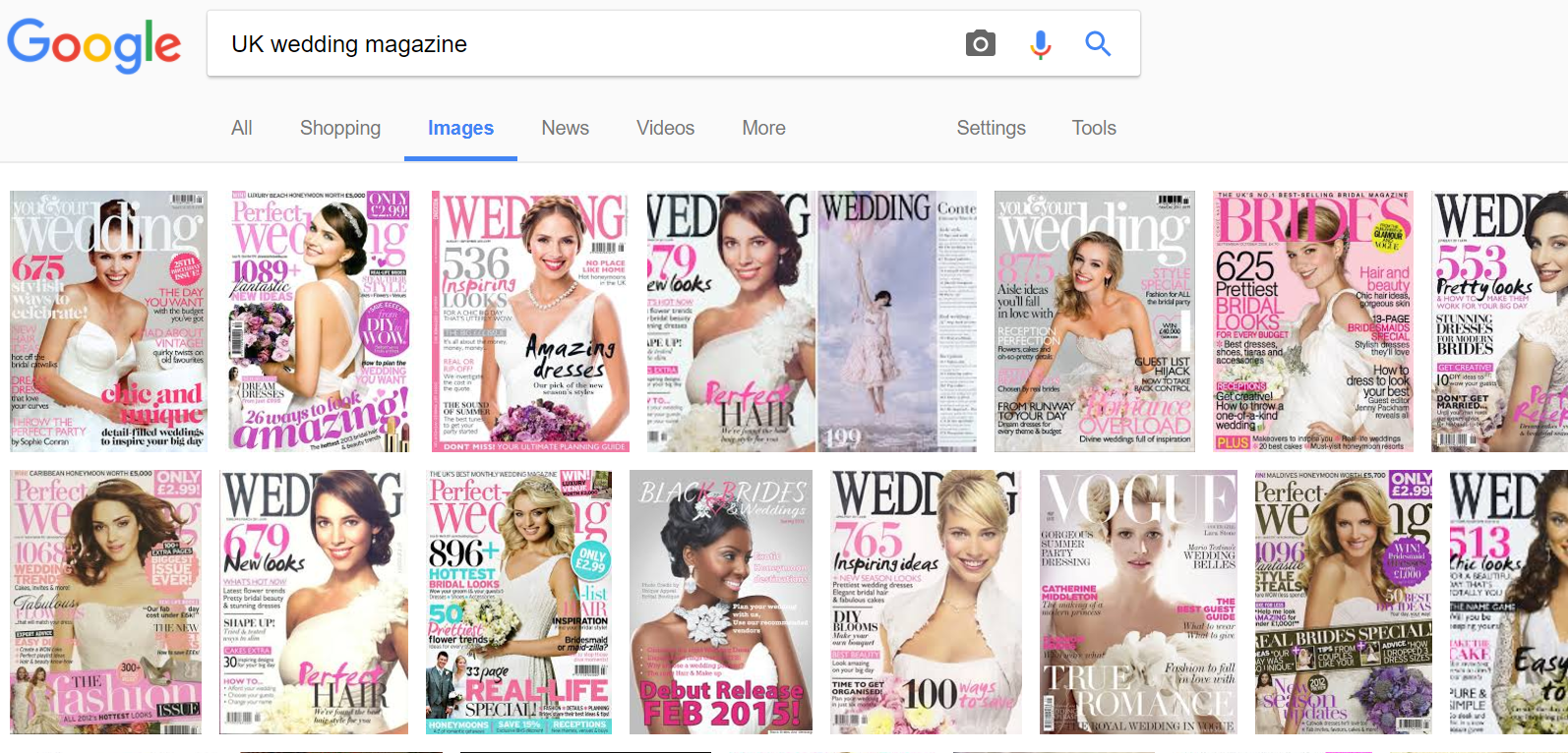 But the media and the online wedding world is still playing catch up and we’re not seeing widespread diversity when it comes to advertisements, magazines and websites. Here are the top Google image results for the phrase ‘UK wedding magazine’: